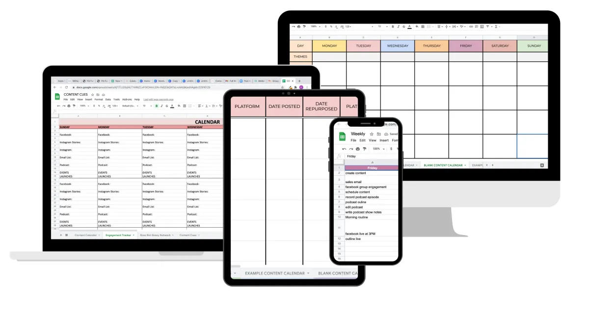 Digital Access Includes: 1. Content Marketing Tracker 2. Content Ideas. 3. Example Content Calendar. 4. Blank Content Calendar. 5. Blank Engagement Plan. 6. Example Engagement Plan. 7. Growth Tracker. 8. Engagement Tracker. 9. Market Research Tracker. 10. Dream Client Language Tracker.